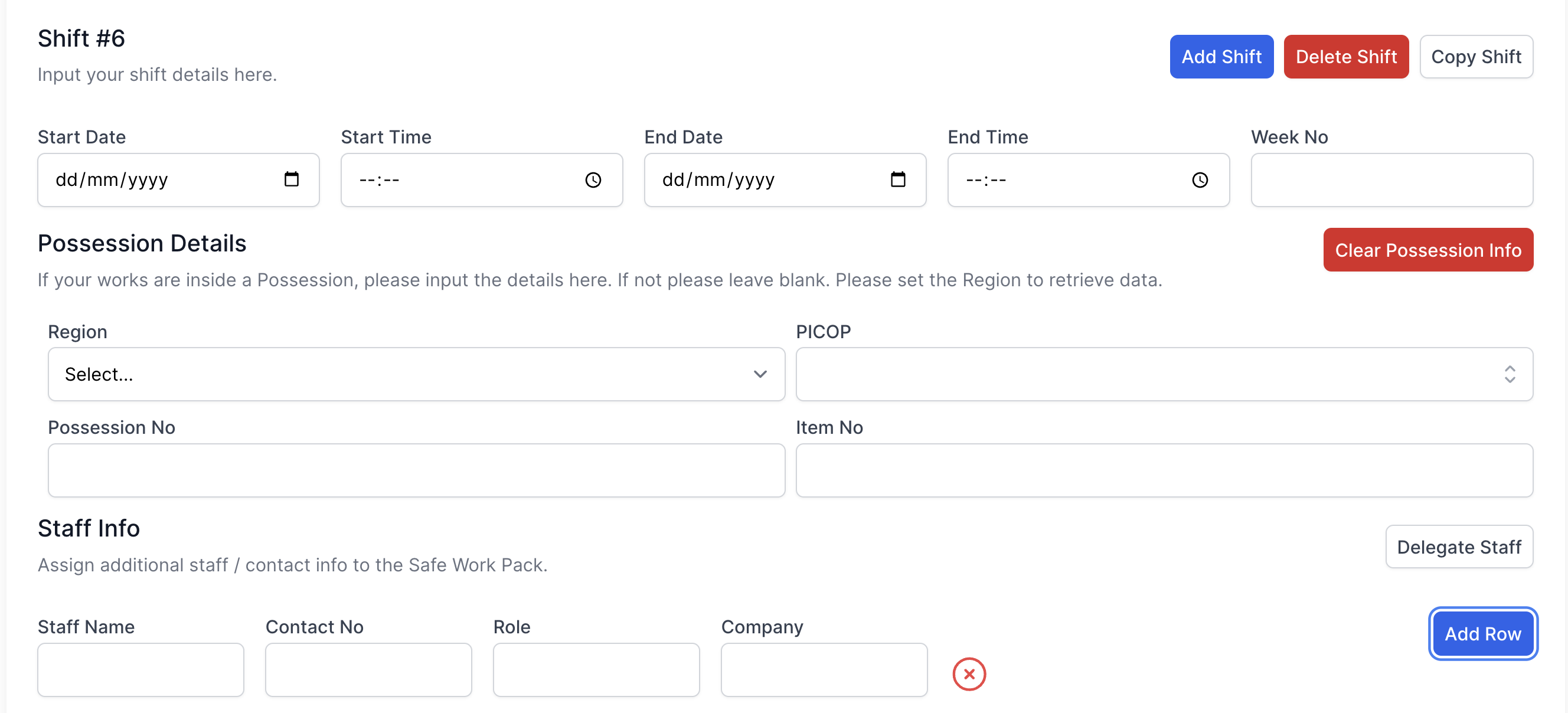 - Once this is done, you can use the 'Add Shift' button on the Safe Work Pack Overview page from the 'Options' dropdown to add extra shifts without additional verification.