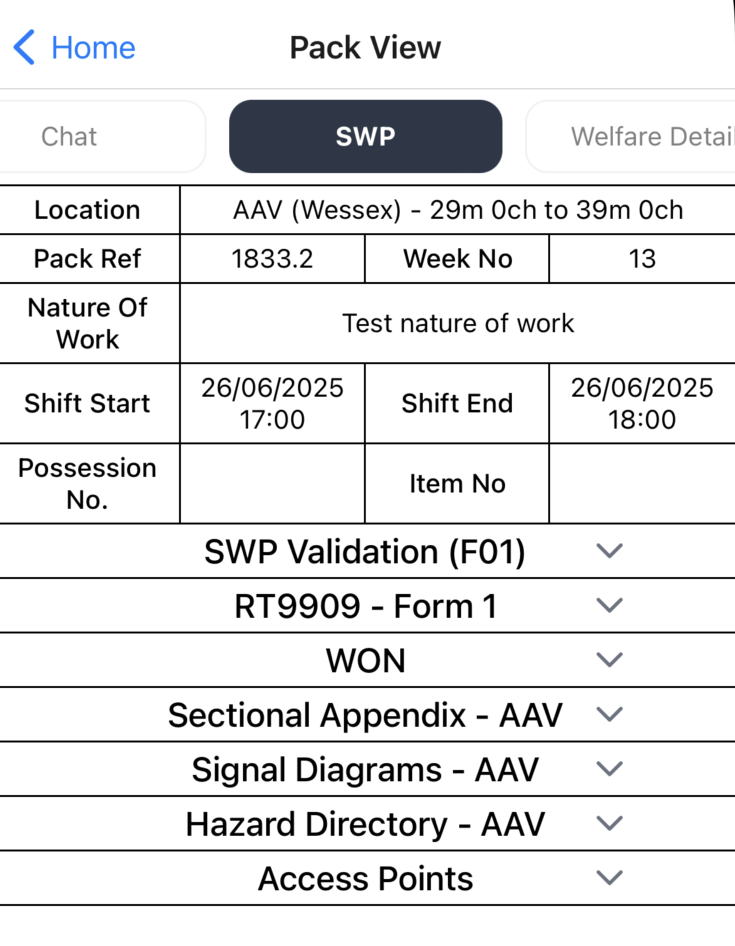 All Safe Work Pack utilisation activities must be completed on the Accurail mobile app. You cannot use, verify, or complete SWPs using the website.