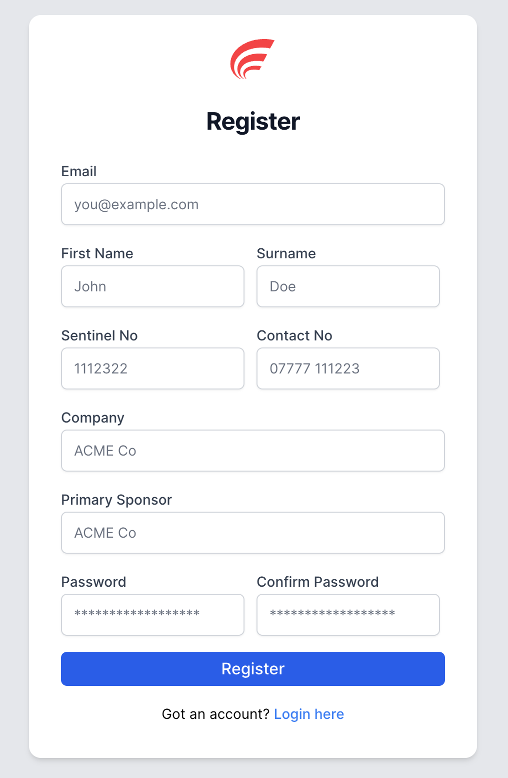 - Company name (please enter this exactly as instructed by your company provider, as it's case-sensitive)